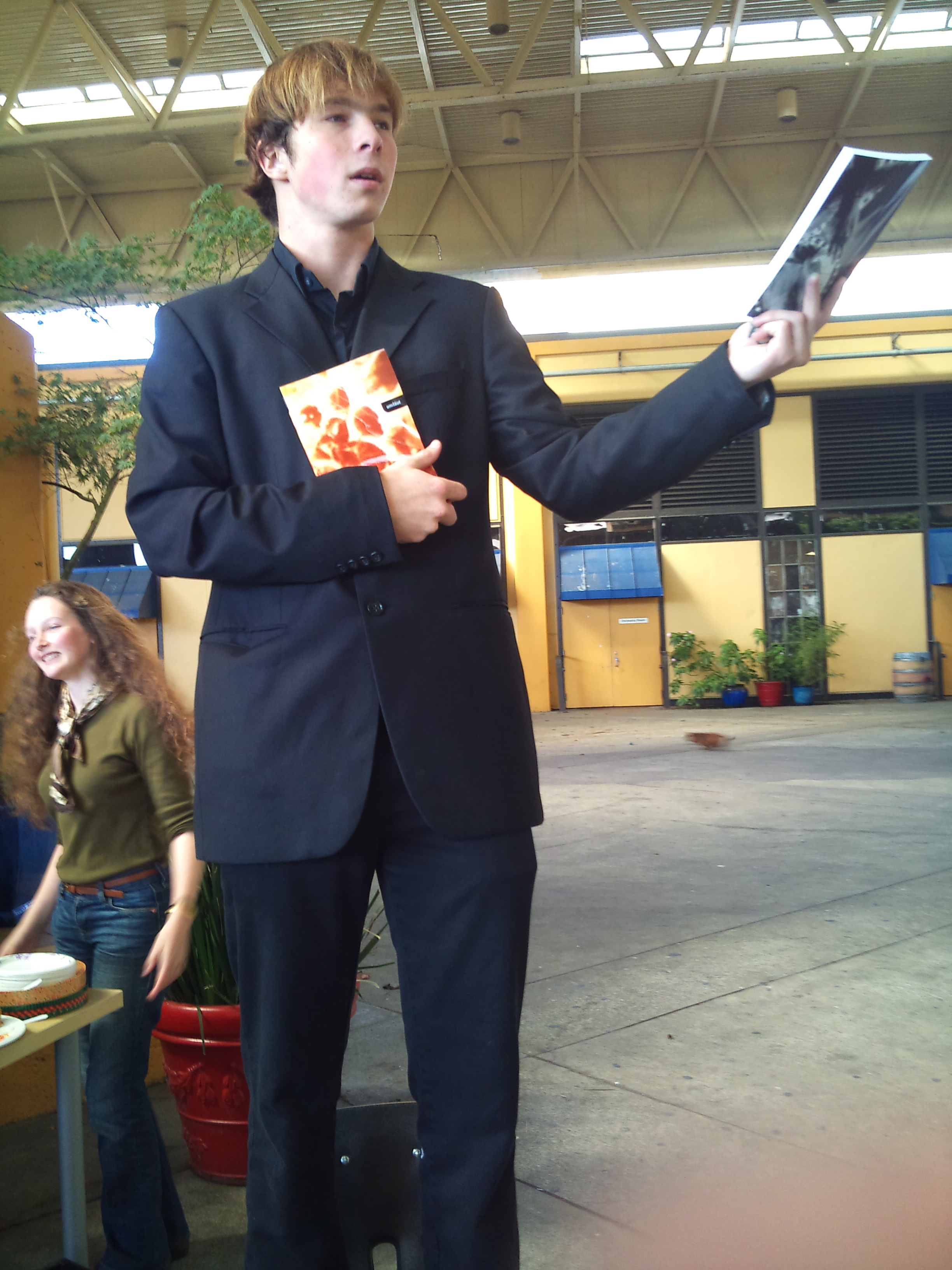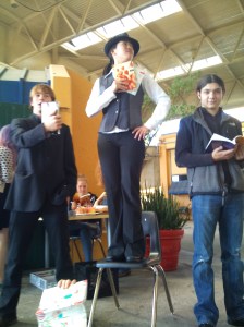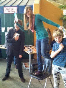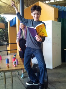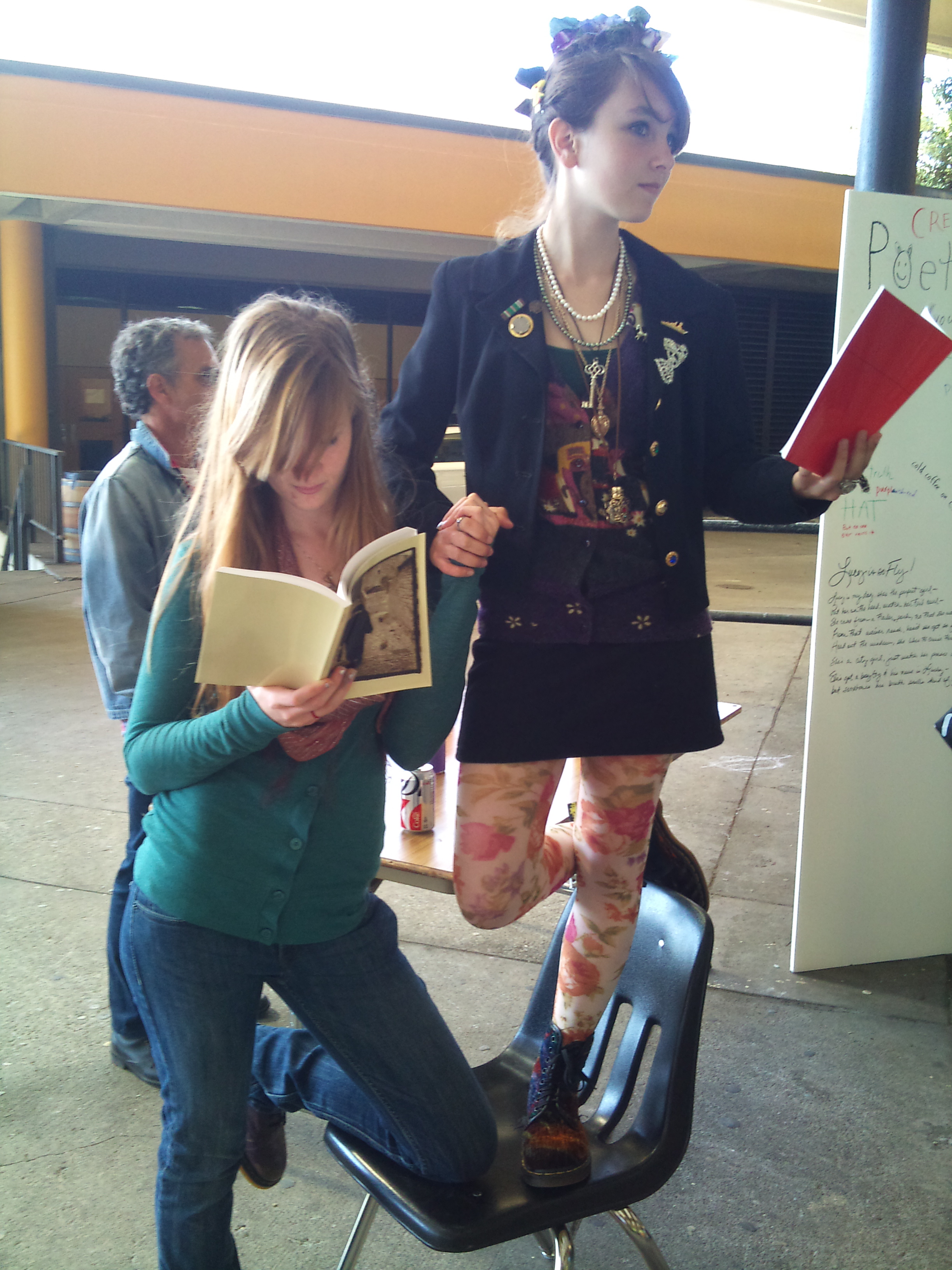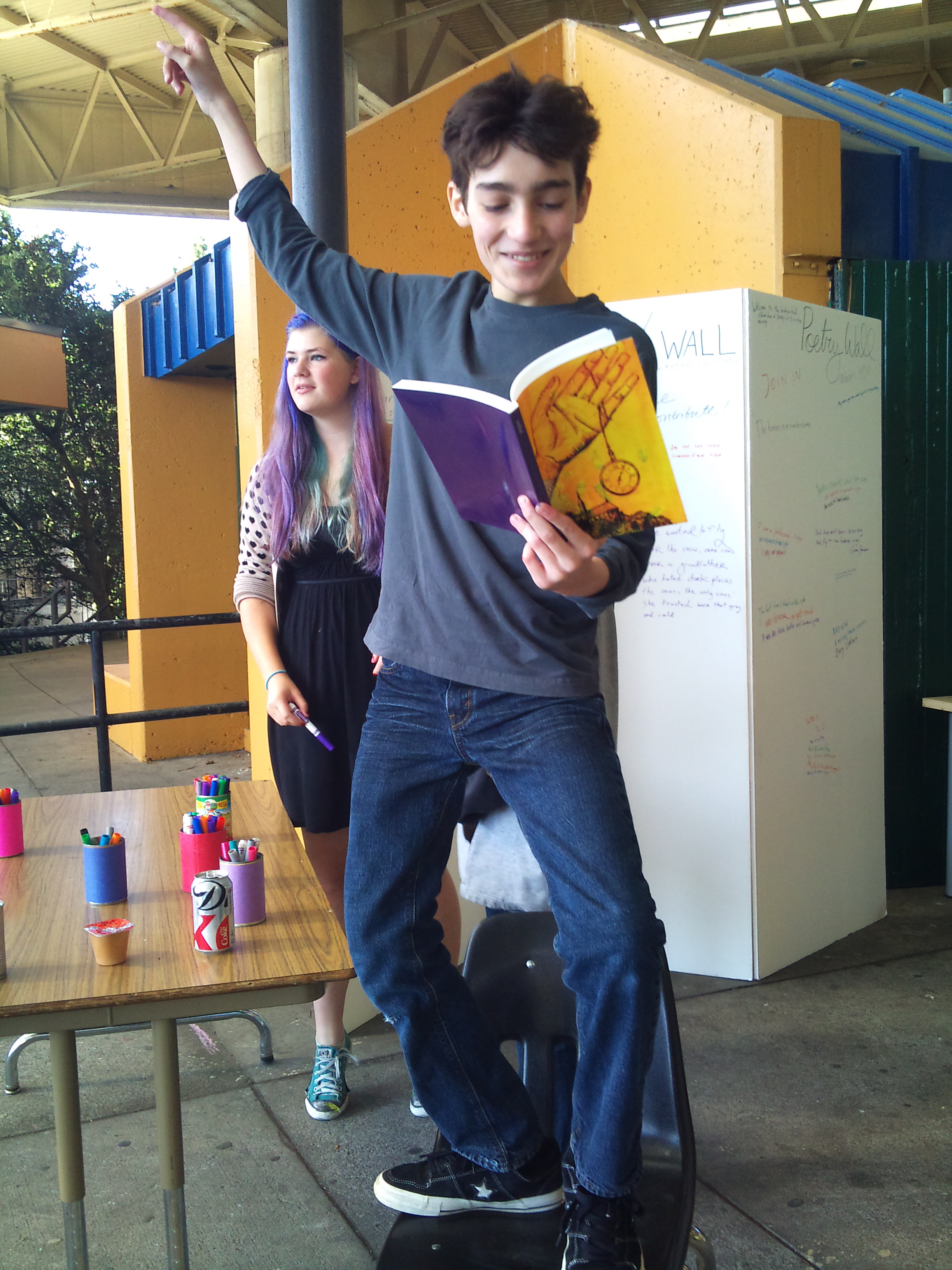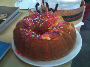 Many thanks to those who came today! Creative Writing was one of the first of the departments to set up our station– we all arrived before 10 to bring out the tables, Ümaluts, and the Poetry Wall. Many passersby contributed and bought Ümlauts– we made $110 dollars in profit. We gave everyone that buys an Ümlaut a piece of cake for free. Kudos to Avi, who not only baked it (yellow, like CW), but also made the lemon frosting and the “CW!” in chocolate (we made a dollar off the “C” alone).
