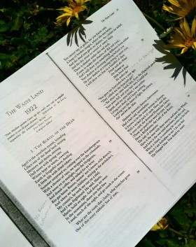 Take Nick, for example, one of our darling freshmen with a passion for Eliot. He took Creative Writing on an excursion to the sunny patch of slick green grass and wildflowers (real life is allowed to take liberties with clichés) and spirited us away to the world of “The Waste Land,” “The Love Song of J. Alfred Prufrock,” and an excerpt from “Four Quartets.”