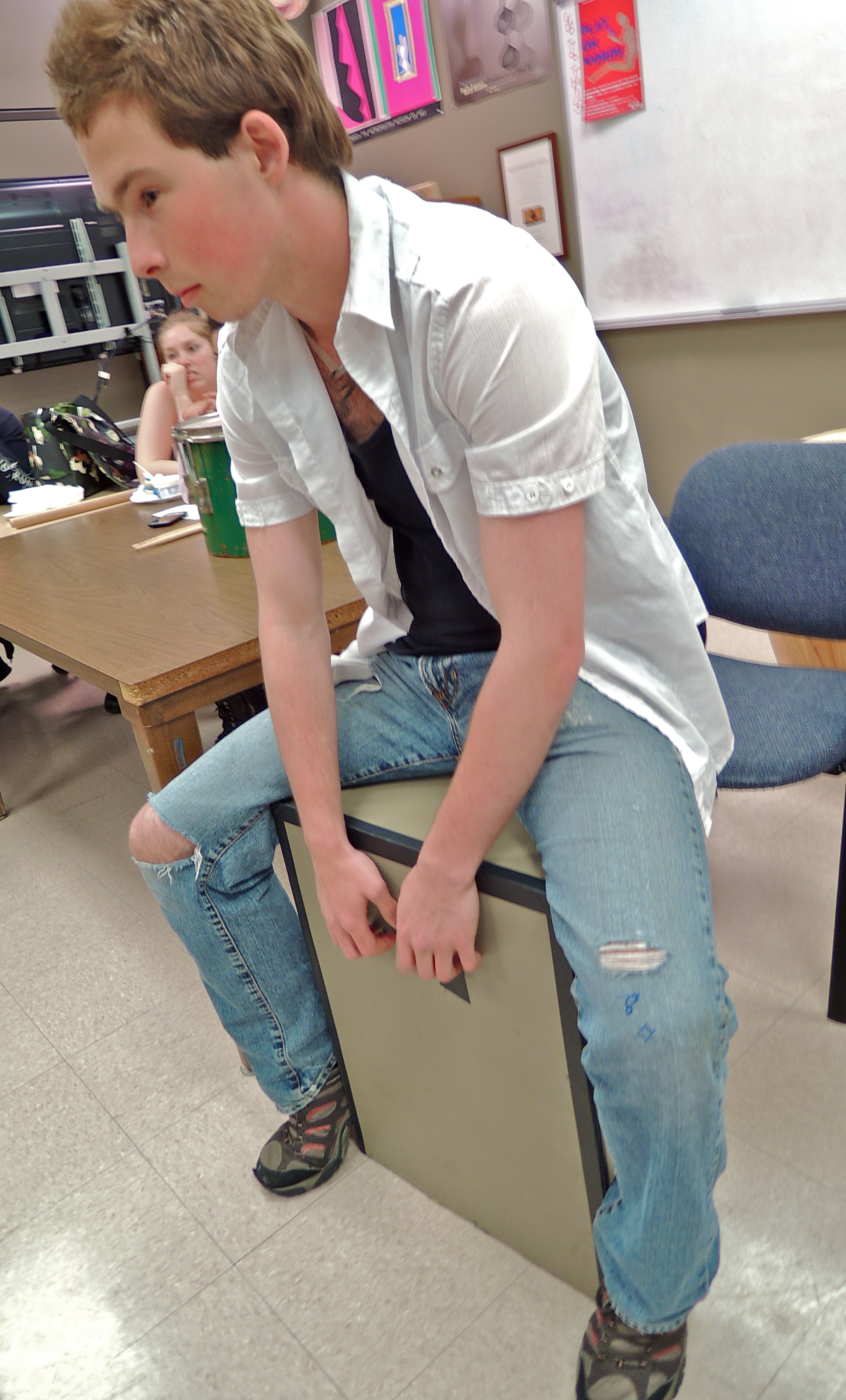 Jules Cunningham, sophomore, is our resident Tom Waits groupie-stalker (by his own claim). He began class with songs/poems by Tom Waits, then, giddy in his fanboying haze, told everyone to split up into groups of three or four and emulate the style: poetry with accompanying music to set the scene, to fill in the blanks the words left.