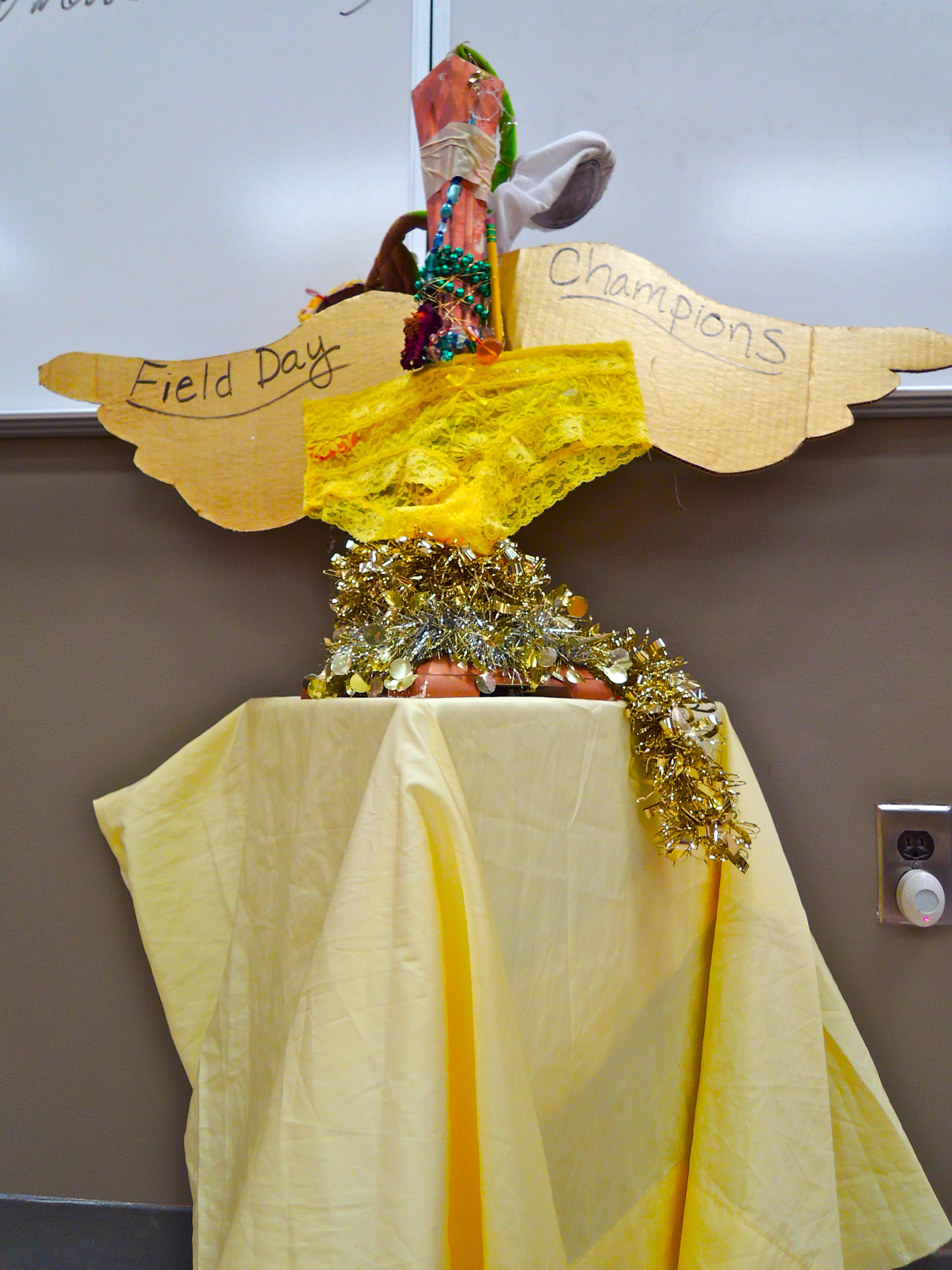 Now, as I said: not a lot of school spirit. I doubt that that makes me an exception in a school of brooding teenage artist-types, but I believe it bears mentioning. At this point, I barely dress up for spirit week, I tend to avoid interaction (with pretty much anyone at school) whenever possible both because it terrifies me and does not hold great weight in my mind. But on Field Day, I found myself screaming and cheering while hardly aware of it, and when we tallied up our points (even before the winner was announced) I could not stand still for excitement. When our department was called up and presented with the trophy (or rather when we ran out onto the track and claimed it), I was leaping and celebrating with all the competitive types who made a point of practicing our pyramid until it could be done in less that five seconds. When people began gushing about their joy over winning back in room 202, I found myself nodding and smiling.