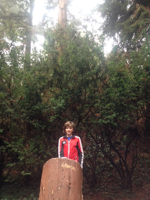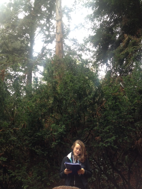 We almost didn’t go because of the weather. It was damp and gray, and we were worried about getting cold. But we decided by popular vote to go anyways and get our butts wet. We went to the redwood grove, where there is a log podium and some benches. We took turns going up to the podium and standing on the wobbly stump to read short pieces we’d written.